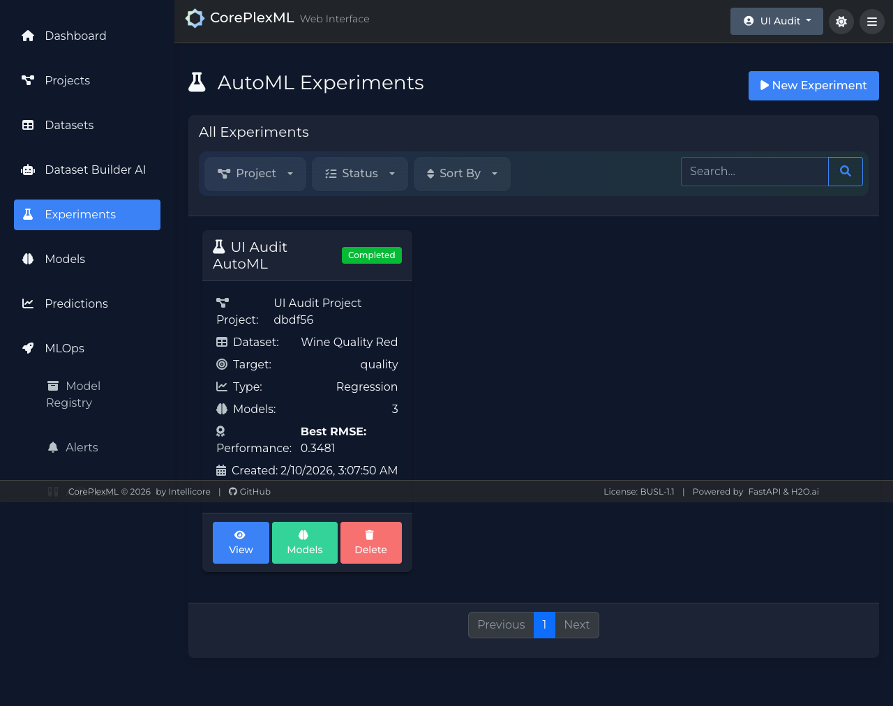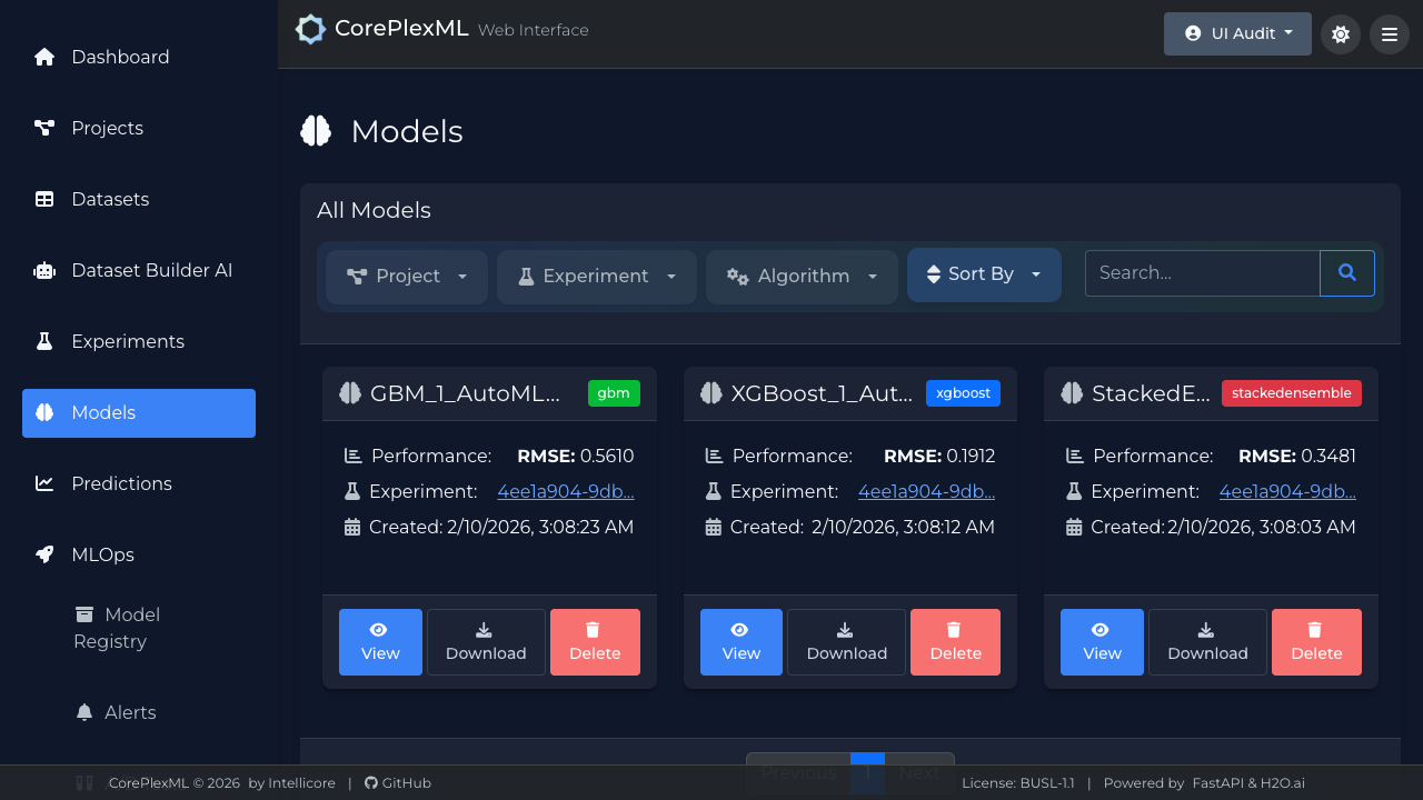 Open best model detail and inspect: - Metrics. - Feature importance/explainability (if enabled). - Artifact/version metadata.