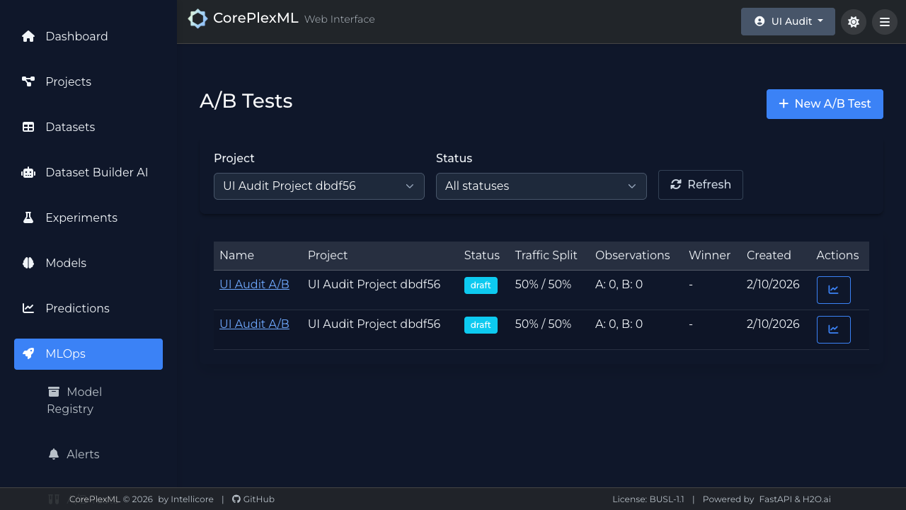 MLOps > A/B Tests.Crear test con: - Modelo baseline (A). - Modelo candidato (B). - Split de trafico. - Metrica principal. - Tamano minimo de muestra y duracion.